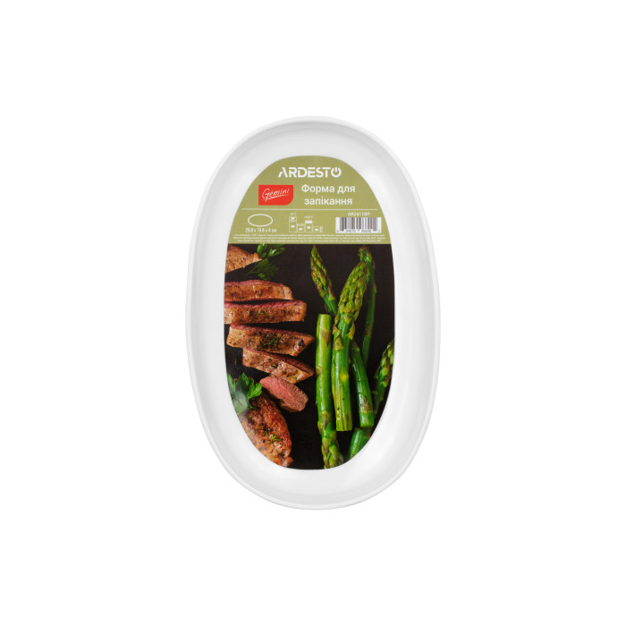 Форма для запікання ARDESTO серії Gemini виготовлена з порцеляни. Овальна форма 29.8 x 18.8 x 4 см. Можна мити в посудомийній машині.