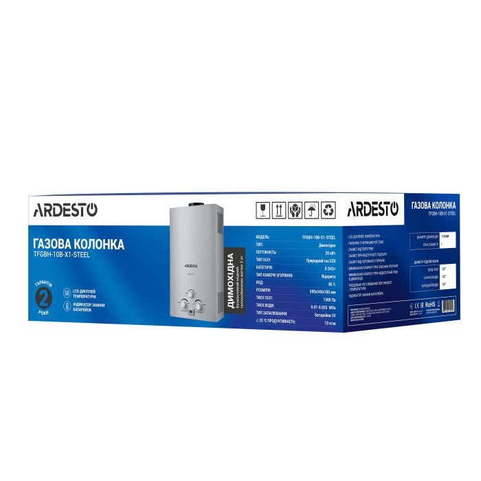 Газовая колонка Ardesto X1, 10 л/мин., 20 кВт, розжиг от батареек, дисплей, нерж. сталь (TFGBH-10B-X1-STEEL)