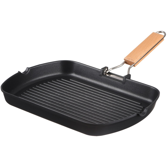 Чорна алюмінієва сковорода-гриль завдяки товстому дну (5 мм) і відповідному рельєфу поверхні дає змогу в домашніх умовах створити ефект приготування їжі на грилі. Дерев’яна ручка не нагрівається та є зручною в користуванні. Розмір сковороди – 34 × 24 см. Висота стінок – 4 см, товщина – 1,5 мм. Сковорода сумісна з газовими, електричними, склокерамічними, індукційними та галогенними плитами. Не рекомендовано мити в посудомийній машині.