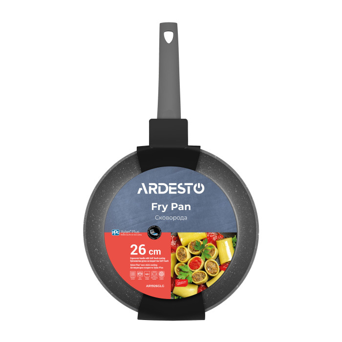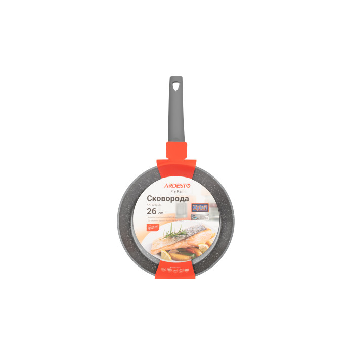 Сіру сковороду діаметром 26 см виготовлено з кованого алюмінію та оснащено покриттям Xylan Plus, що має високі антипригарні показники і є стійким до механічних пошкоджень. Висота стінок сковороди – 48 мм, товщина – 2,6/4 мм, товщина дна – 2,6 мм. Ручку вкрито покриттям Soft-touch. Сковороду можна використовувати на газових, електричних, склокерамічних, індукційних та галогенних плитах і не можна мити в посудомийній машині.