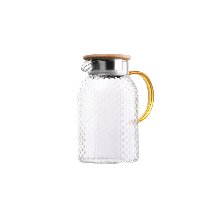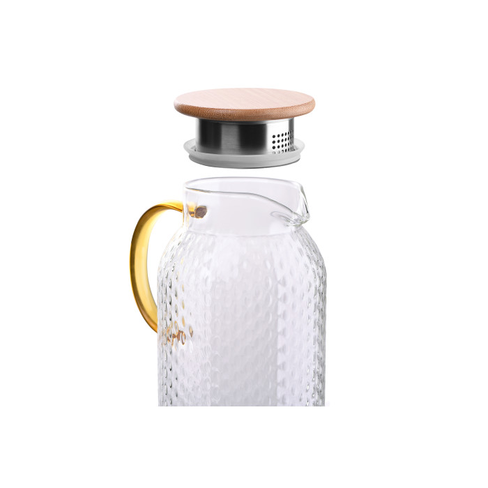 Глечик з кришкою об’ємом 1500 мл для гарячих та холодних напоїв. Виготовлений з термостійкого боросилікатного скла, а кришка з нержавіючої сталі та дерева, доповнена силіконовим ущільнювачем.