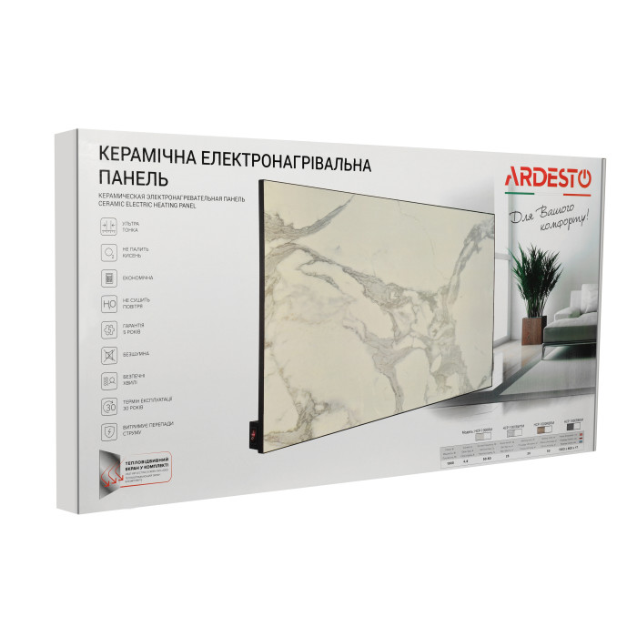Керамічна інфрачервона електронагрівальна панель з магнезитовою плитою. Розрахована на обігрів 20 м2. Ультратонкий корпус Ardesto HCP-1000 не відніме зайвого простору, а зовнішній вигляд відмінно доповнить та прикрасить будь-який інтер’єр. Пристрій не спалює кисень, не сушить повітря, не виділяє хімічних сполук і неприємних запахів, а ще абсолютно безшумний. Панелі доступні у декількох забарвленнях, стилізованих під мармур.