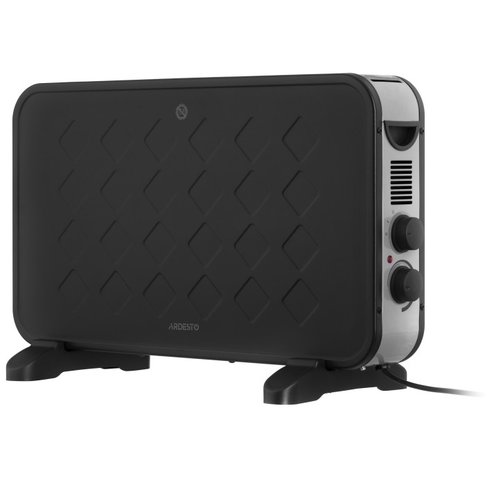 Электрический конвектор с механическим управлением черного цвета со стильным узором ромбы в черном цвете, классом защиты IP20 и двумя режимами мощности 1 250/2 000 Вт. Оснащен регулируемым термостатом и рассчитан на обогрев помещений площадью до 20 м2. Класс энергозащиты - первый. Есть защита от перегрева и индикатор питания нагревательного элемента. Конвектор имеет возможность напольной установки, благодаря компактным опорам, которые поставляются в комплекте с обогревателем.