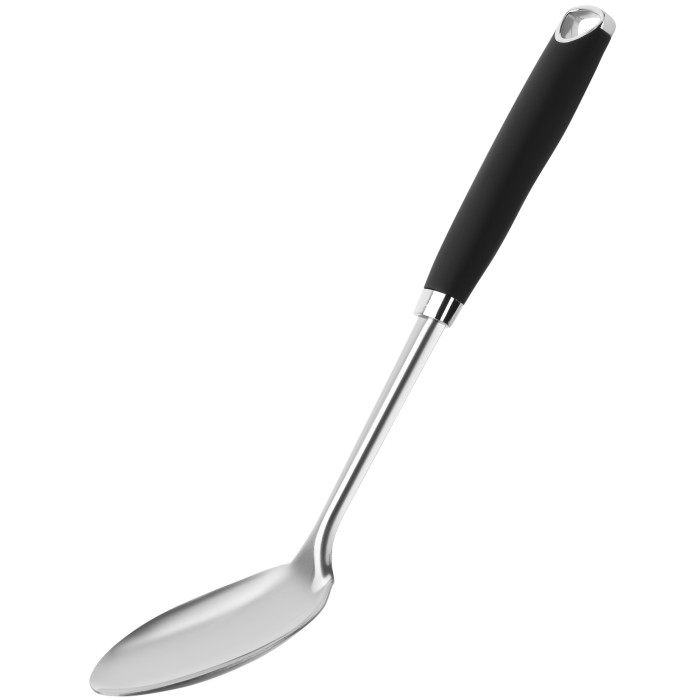 Кухонна ложка з нержавіючої сталі завдовжки 33 см. Оснащена зручним пластиковим руків’ям, що не нагрівається і є приємним на дотик. Стане надійним помічником під час готування страв у великому і середньому посуді. Не рекомендовано мити в посудомийній машині.