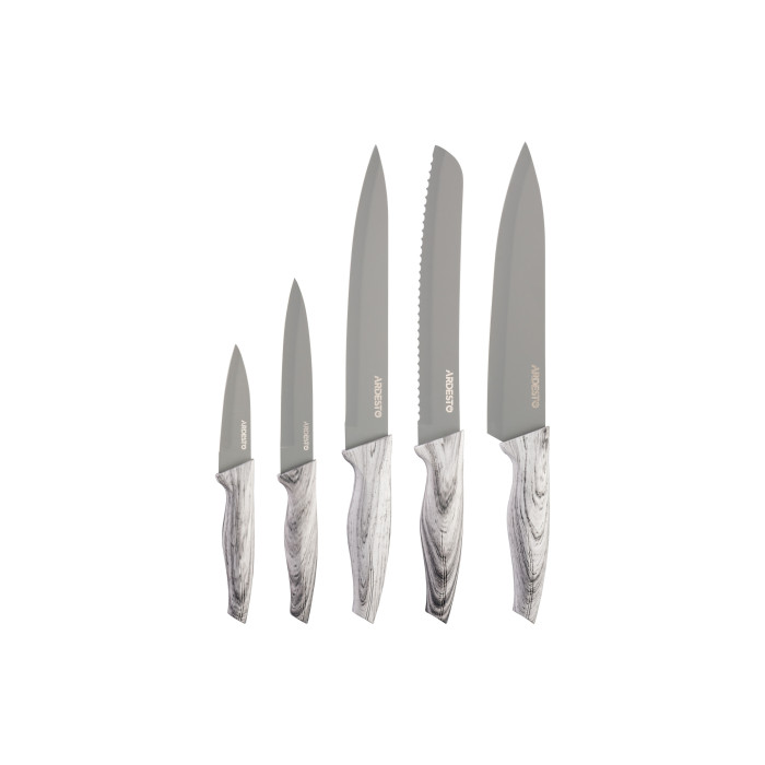 Ножі з набору ARDESTO Black Mars служитимуть довго та впораються з будь-яким завданням на кухні на найвищому рівні. Склад набору забезпечить абсолютний комфорт під час готування й містить: кухарський ніж (20,3 см), універсальний ніж (12,7 см), ніж для хліба (20,3 см), ніж слайсерний (20,3 см) і ніж для чищення овочів (8,9 см).