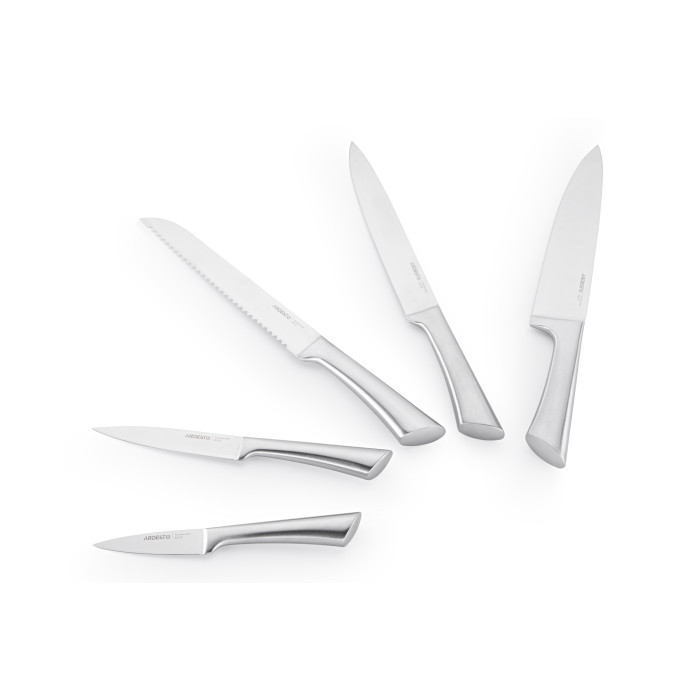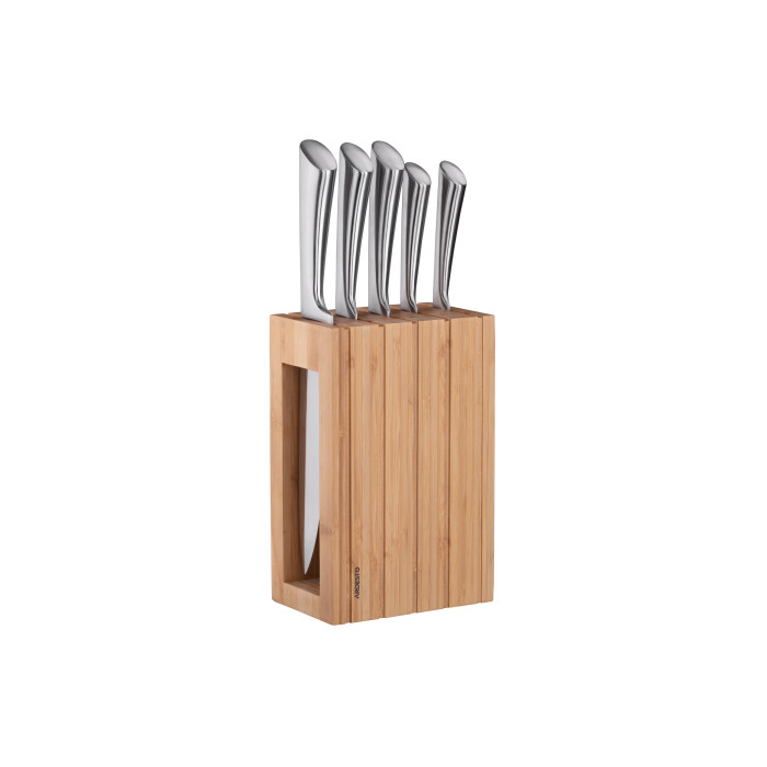 Набір складається з п’яти ножів серії Black Mars, до якого входять універсальний ніж, ніж кухарський, ніж для хліба, ніж для овочів, ніж-слайсер, та бамбукового блоку. Леза та ручки виготовлені з нержавіючої сталі. Підходить для використання в посудомийній машині.