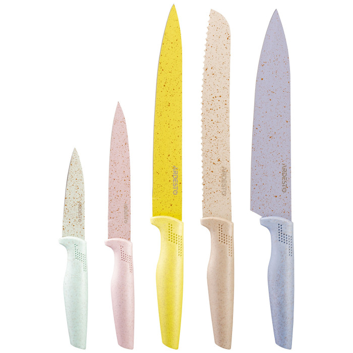 Аби приготування смачних страв дарувало задоволення, необхідно мати під рукою зручне та якісне кухонне приладдя, незмінною складовою якого є ножі. Добре, якщо їх кілька, як у наборі ARDESTO Fresh, який, крім іншого, дарує естетичне задоволення, бо містить: кухарський ніж (20,3 см) синього кольору, універсальний ніж (12,7 см) рожевого кольору, ніж для хліба (20,3 см) бежевого кольору, ніж слайсерний (20,3 см) салатового кольору та ніж для чищення овочів (8,9 см) блакитного кольору.