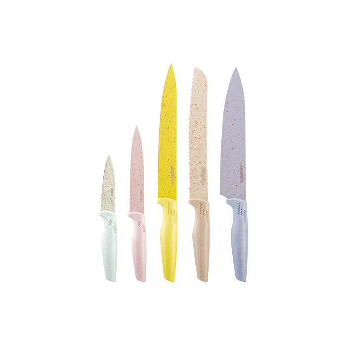 синій /(кухарський ніж), бежевий /(для хліба), салатовий /(слайсерний), рожевий /(універсальний), блакитний /(ніж для чистки овочів)