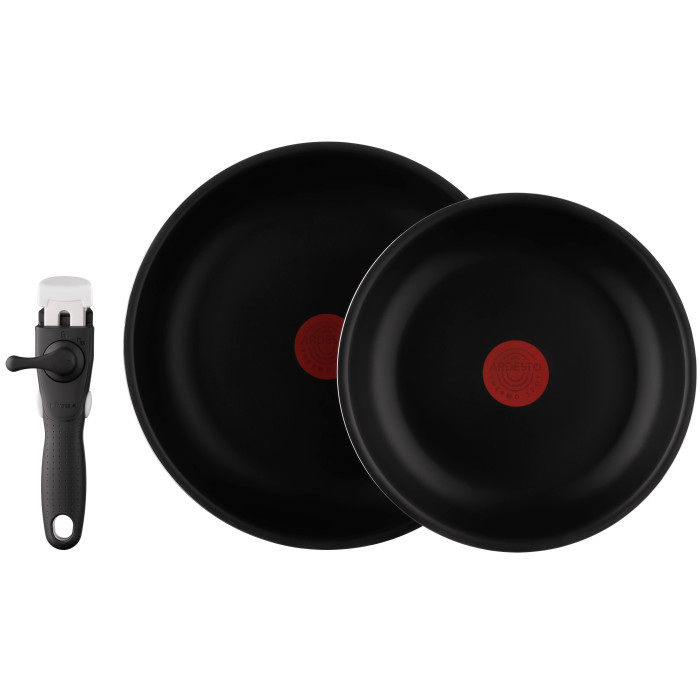 Набір складається із трьох предметів: двох пателень і знімного бакелітового руків’я із soft-touch-покриттям. Є надзвичайно вдалим рішенням для любителів розумно використовувати вільний простір. Сковороди виготовлено з алюмінію, зсередини вкрито протипригарним покриттям. На дні завтовшки 2,5 мм передбачено датчик температури.