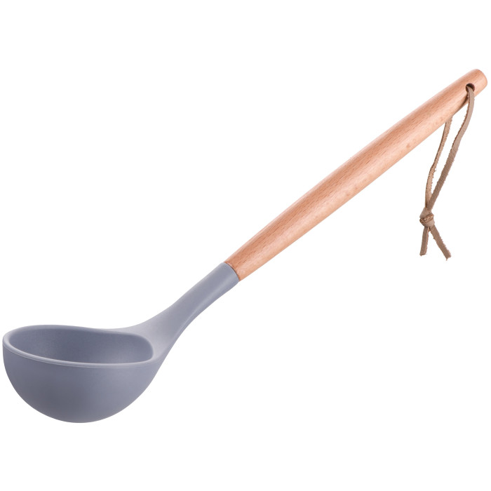 Силіконовий ополоник завдовжки 31 см і діаметром ківшу 7 см. Із дерев’яним руків’ям, що не нагрівається і є приємним на дотик. Термостійкий – витримує температуру до 180 °C. Мити в посудомийній машині не можна.