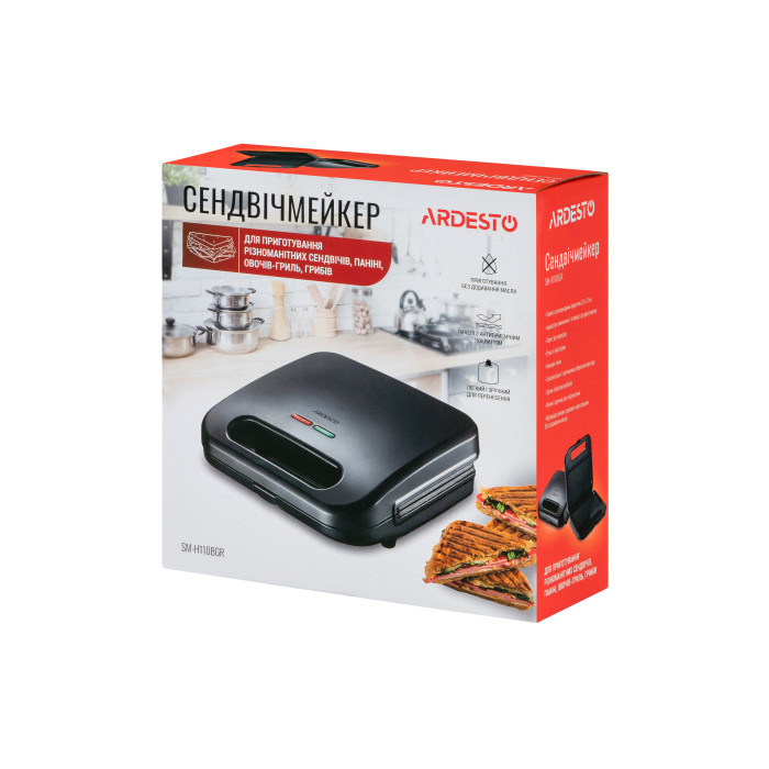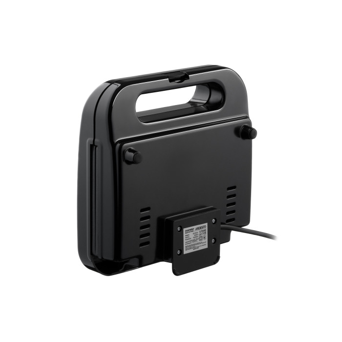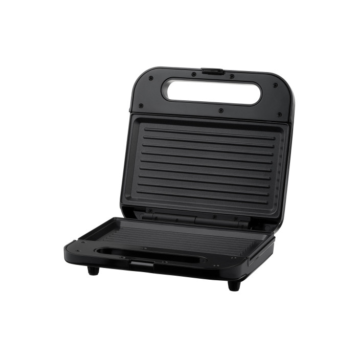 Сендвічмейкер чорного кольору з потужністю 700 Вт та однією пластиною для приготування різноманітних сендвічів, паніні, овочів гриль та грибів.