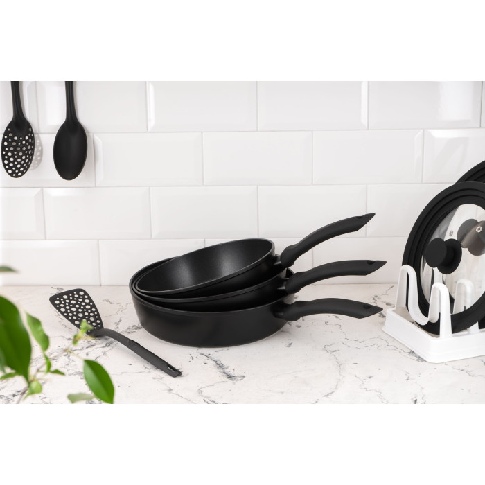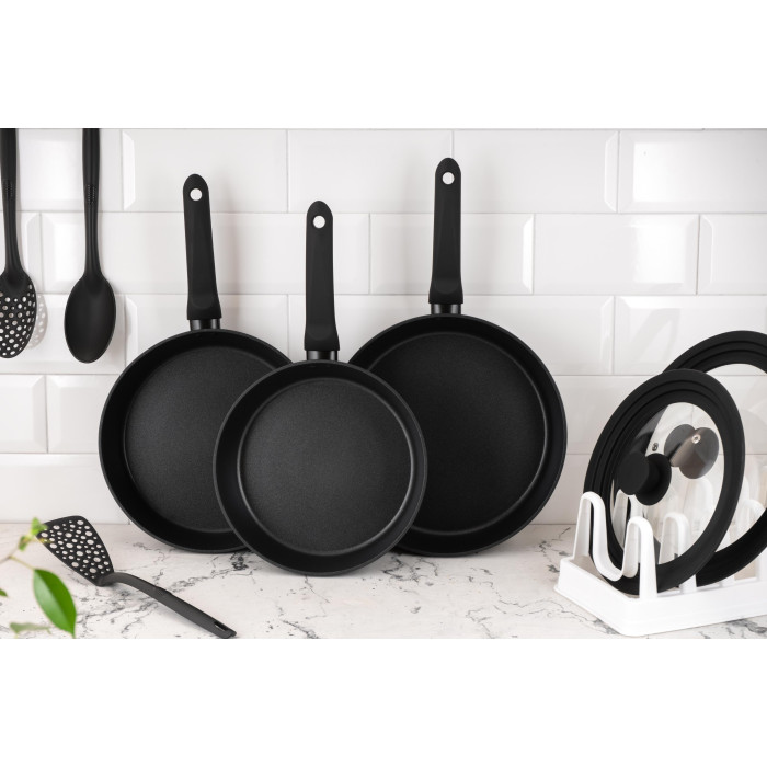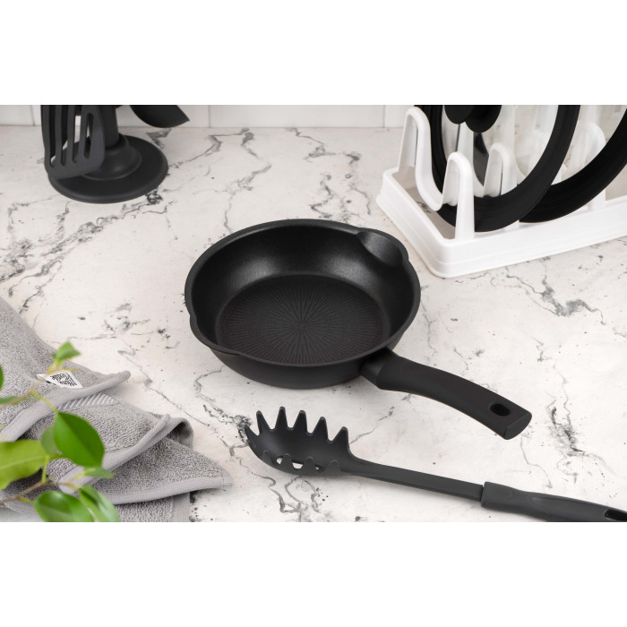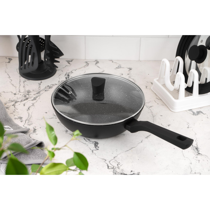 Gemini Gourmet Bolzano – вместительная сковорода с высокими стенками и удобной рукояткой, которая понадобится, в частности, для тушения или жарки. Диаметр изделия – 26 см. Сковорода, изготовленная из кованого алюминия, быстро и равномерно нагревается. Высокие стенки (7 см) предотвращают разбрызгивание жира, поэтому варочную поверхность придется убирать немного реже. Относительно других особенностей: внутренняя поверхность сковороды имеет противопригарное покрытие, а рукоятка – soft-touch.