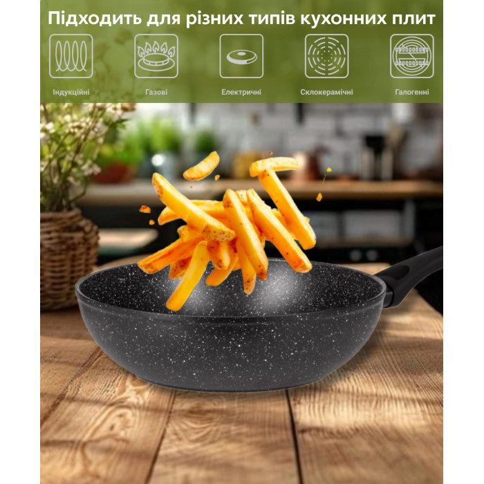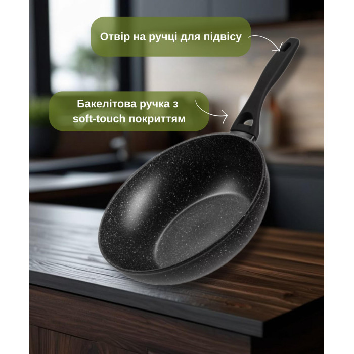 Сковорода WOK серии Gemini Gourmet Anzio изготовлена из кованого алюминия в черном цвете. В серии посуды Gemini Gourmet используется мраморное антипригарное покрытие. Ручка изготовлена из бакелита с Soft-touch покрытием. Сковорода совместима со всеми видами плит, включая индукционную.