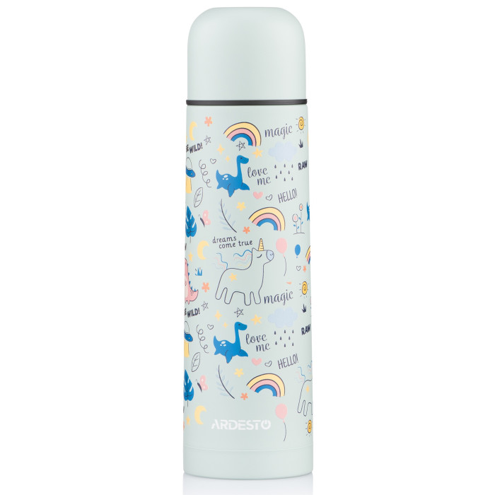 Термос для дітей із нержавіючої сталі з цікавим принтом сірого кольору стане в пригоді будь-якої пори року, адже зберігає температуру гарячих напоїв упродовж 12 год, а холодних – 24 год. Відкривається термос спеціальною кнопкою. Зручний об’єм – 0,5 л. Кришку можна використовувати як чашку, в яку поміщається 100 мл напою. Мити в посудомийній машині не рекомендовано.