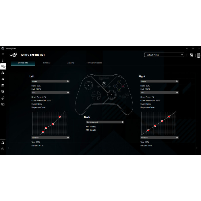 Контроллер ROG Raikiri: две дополнительные кнопки на тыльной стороне, триггеры с возможностью настройки хода и "мертвой зоны", ЦАП ESS, регулировка чувствительности джойстика и кривой отклика, идеально подходит для игр на ПК, ноутбуков и консолей Xbox следующего поколения.