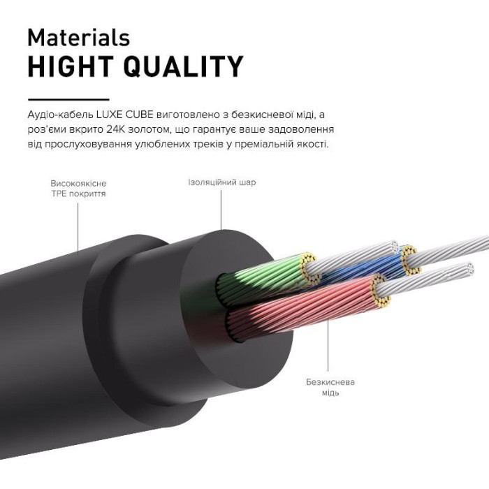 Сумісний з усіма пристроями зі стандартним роз'ємом 3,5мм. Аудіо кабель LUXE CUBE виготовлено з безкисневої міді, а роз'єми вкрито 24К золотом, що гарантує ваше задоволення від прослуховування улюблених треків у преміальній якості.