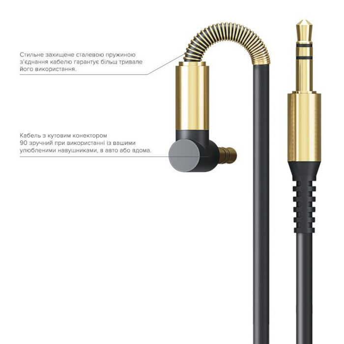 Кабель з кутовим конектором 90 зручний при використанні, в авто або вдома. Стильне захищене сталевою пружиною з'єднання кабелю, гарантує більш тривале його використання.