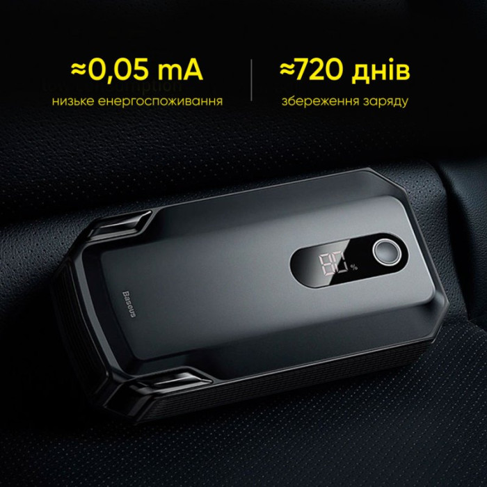 Автомобільний пусковий пристрій Baseus Starter Jump Starter Booster 20000 mAh Black — це портативний комплект, куди входить безпосередньо сам акумулятор з ємністю 20000 мАг, а також сучасні затискачі і кабелі для підзарядки самого пристрою. Даний прилад дозволяє оперативно завести транспортний засіб, після чого доїхати до місця, де можна провести ремонт у спокійніших умовах.ШИРОКИЙ ФУНКЦІОНАЛ ПРИСТРОЮВиробники пристрою Baseus Starter Jump Starter Booster 20000 mAh Black заявляють, що повного заряду приладу буде достатньо, щоб завести автомобіль десь 60 разів. На практиці після правильного підключення затиску до автомобільного акумулятора на запуск йде буквально кілька секунд. Пусковий струм при цьому може бути 1000 А, а піковий струм досягатиме 2000 А.Функціонал пристрою не обмежується роботою з автомобільними акумуляторами, оскільки характеристики дозволяють заряджати також і мобільні телефони, планшети або ноутбуки. Є й сучасна функція швидкої підзарядки.З погляду дизайну девайсу, йдеться про корпус з незвичайними формами та стильним чорним забарвленням. Є також інформативний дисплей, що дозволяє судити, скільки конкретно залишилося заряду і чи не потрібно пристрій заряджати. Хоча прилад можна довгий час взагалі не застосовувати, і він все одно збереже більшу частину свого заряду – близько 85%. Невеликі габарити і вага дають можливість носити з собою цей гаджет саме повербанком або просто покласти його в автомобільний бардачок.ПИТАННЯ БЕЗПЕКИ ПРИЛАДУПотенційно небезпечні сценарії використання Baseus Starter Jump Starter Booster 20000 mAh Black нівелюються завдяки інтелектуальним затискачам — вони тестувалися на різних рівнях, відповідно, ймовірність отримання пошкоджень при не дуже акуратному використанні мінімальна. Ще варто сказати про захист від таких проблем:— Екстремальний перегрів пристрою.