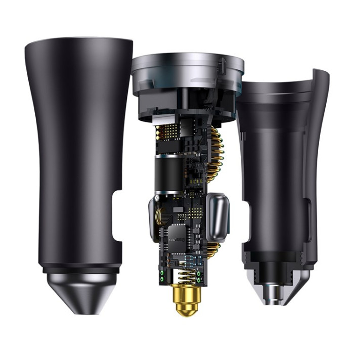 Baseus Golden Contactor Pro Dual Fast Charger Car Charger C+C 40W Dark Gray ─ це автомобільний пристрій для зарядки гаджетів з технологією Quick Charge. Пристрій має 2 USB-входи Type-C. З його допомогою можна швидко заряджати різні девайси в автомобілі.Аксесуар має стильний дизайн, зовнішній корпус виготовлений із металу, який стійкий до високих температур та зовнішніх пошкоджень. Також має кругову підсвітку, яка світиться під час підключення та допомагає підключатись до пристрою в темряві.Для безпеки гаджетів в пристрій вбудований інтелектуальний захист від короткого замикання, перепадів напруги, перегріву, перевантаження та перезарядки.Особливості: