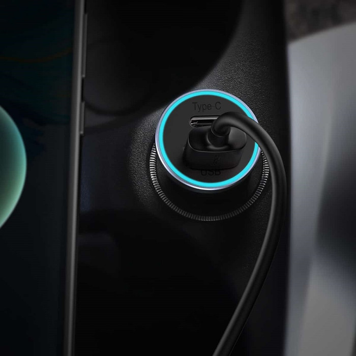 Baseus Golden Contactor Pro Dual Quick Charger U+C 40W (With Baseus Simple Wiring USB для Type-C 5A 1.0m) Dark Gray — автомобільний зарядний пристрій з 2 портами: Type-C і USB-A, а також синьою підсвіткою.Основні характеристики: