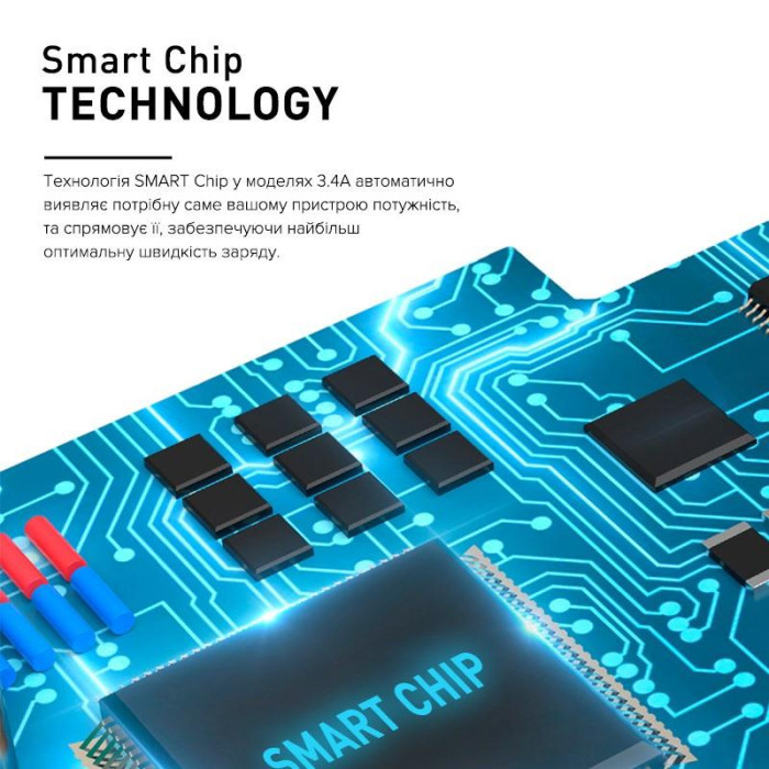 Технологія SmartCHIP у моделях 3.4А автоматично виявляє потрібну саме вашому пристрою потужність, та спрямовує її, забезпечуючи найбільш оптимальну швидкість заряду. Багаторівнева система безпеки захистить ваші пристрої від перенавантаження, короткого замикання, стрибків напруги та перегріву.