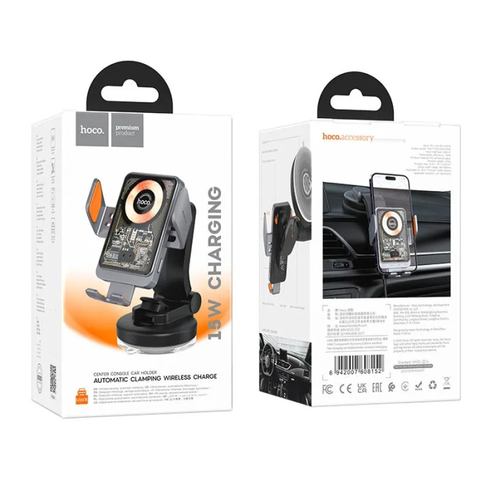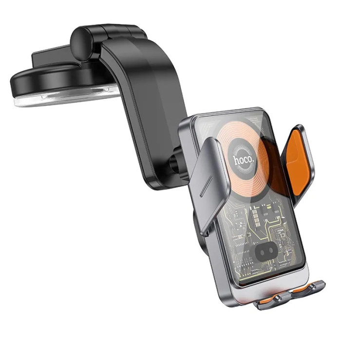 Автотримач для телефона з БЗП HOCO HW8 Transparent Discovery Edition wireless fast charging car holder(center console) Metal Gray