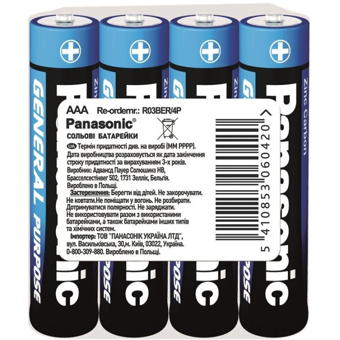 Батарейка Panasonic GENERAL PURPOSE вугільно-цинкова AAA(R3) плівка, 4 шт.