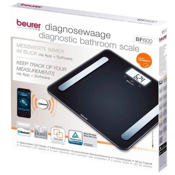 Інноваційні підлогові ваги Beurer BF 600 Pure Black з бездротовим під'єднанням до смартфона або планшета. Завдяки технології Bluetooth low energy результати вимірювань і дані про ваші фізичні показники завжди з вами — вдома, у дорозі, у подорожах. Для оптимального контролю ваги завантажте програму Beurer HealthManager через App Store або Google Play. Підлогові діагностичні ваги, крім простого зважування, дають змогу визначити частку жирової маси, тканинної рідини, м'язової та кісткової маси, рівень основного й активного обміну речовин, індекс маси тіла.