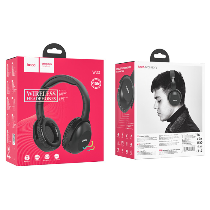 Навушники HOCO W33 — це зручний та функціональний аксесуар для прослуховування музики. Сумісні з більшістю смартфонів та іншими електронними гаджетами, призначені для прослуховування музики бездротового зв'язку Bluetooth 5.0.МАТЕРІАЛИКорпус виконаний з надійного та міцного пластику з матовою поверхнею. Вбудовані високоякісні динаміки забезпечать потужним та насиченим звучанням улюблених композицій. М'які зручні амбушюри щільно сидять на голові, повністю охоплюють вуха, а регульована оголов'я гарантує тривале використання навушників без найменшого дискомфорту.АВТОНОМНІСТЬ І УПРАВЛІННЯМісткість акумулятора 250 мАг дозволяє використовувати гарнітуру в режимі відтворення музики до 10 годин. Час у режимі очікування 200 годин. Щоб повністю зарядити навушники, знадобиться близько 2 годин. Елементи керування, роз'єм для зарядки та jack 3.5 мм розташовані прямо на навушниках.