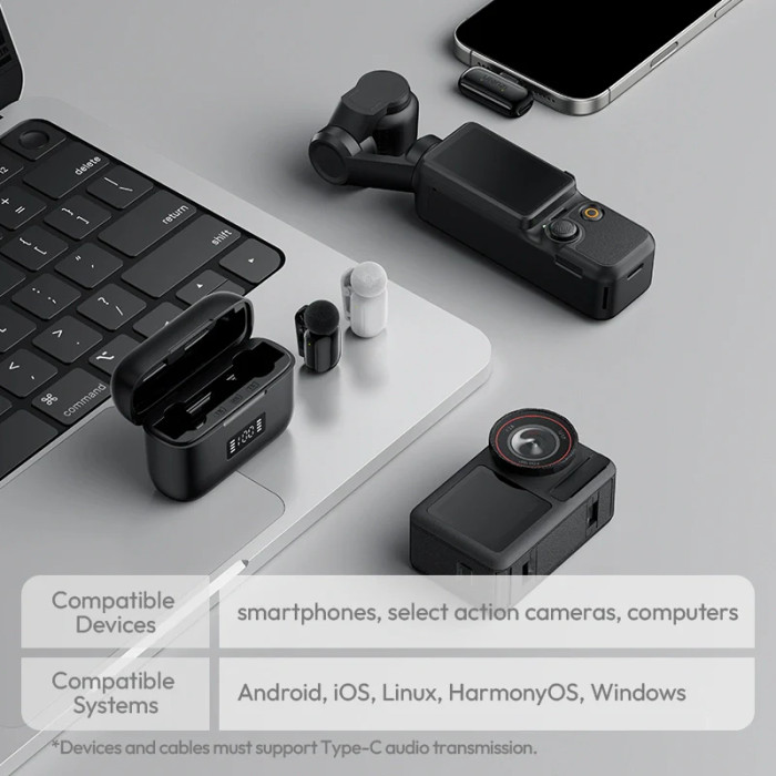 Ulanzi A200 Mini Mic (Black) — подвійний бездротовий мікрофон для телефону з прямим підключенням (без адаптерів) до порту Type-C. Аксесуар дозволяє записувати чистий, натуральний звук без затримок від двох одночасно або одну людину на відстані до 100 метрів від телефону без налаштування або встановлення додаткових програм.Бездротовий мікрофон підтримує підключення до пристроїв напряму в порт Type-C, що працює під будь-якою операційною системою (Android, iOS, Linux, HarmonyOS, Windows).Обидва передавачі Ulanzi A200 Mini мають зовсім невеликі розміри, у них встановлені всеспрямовані конденсаторні мікрофони з інтелектуальною системою шумоподавлення, що дозволяє передавати чіткий звук голосу на телефон. На задній частині є прищіпки для зручного розташування на одязі.Подвійна бездротова мікрофонна система Type-C для телефону обладнана акумулятором 70мАч та кейсом для підзарядки та зберігання з ємністю 350мАч. Вбудованих батарей достатньо на 6 годин безперервного запису. Акумулятор у кейсі розрахований на підзарядку передавачів та приймача до 2-3 разів.КОМПЛЕКТАЦІЯУ комплект поставки Ulanzi A200 Mini входить два передавачі, один приймач з конектором Type-C для телефону, кейс для зберігання та підзарядки.