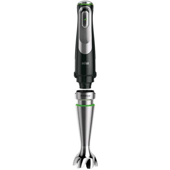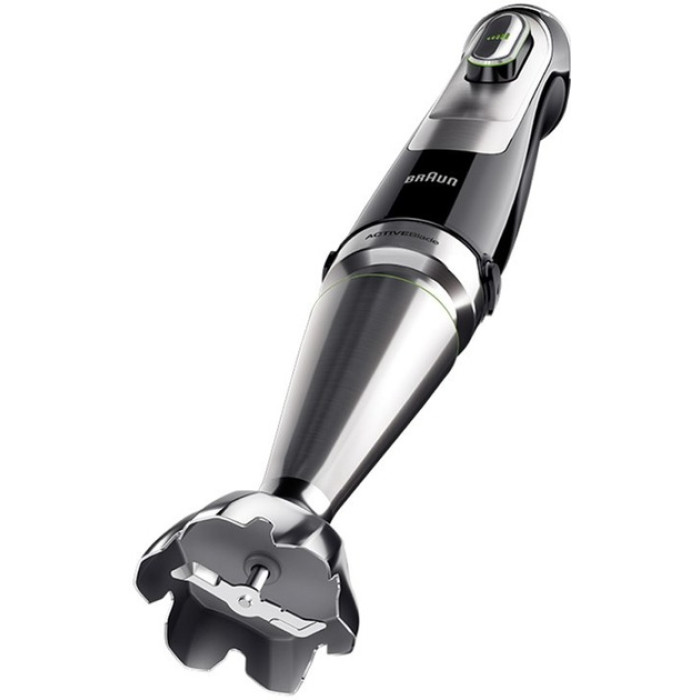 Занурювальний блендер серії MultiQuick 9. Максимальна потужність моторного блоку: 1200 Вт. Кількість швидкостей: регульована. У комплектацію входить: моторний блок із системою EasyClick Plus та технологією SmartSpeed; металева блендерна ніжка з гострими ножами з нержавіючої сталі, виконана за технологією ActiveBlade, PowerBell Plus та SplashControl; насадка подрібнювач на 0,5 л із додатковим ножем для колки льоду; вінчик для збивання та перемішування; мірна склянка з чіткою мірною шкалою на 600 мл.