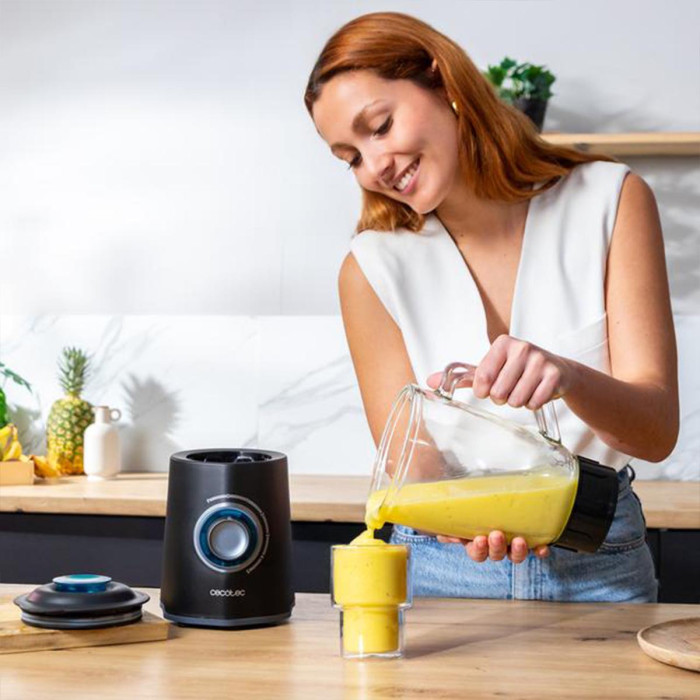 Блендер має глечик з ударостійкого литого скла об’ємом 1,5 л зі зручним носиком для наливання, щоб уникнути бризок і плям.