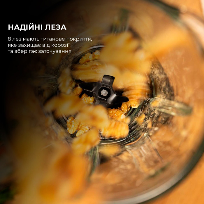 Зазвичай у лез блендера 4 лопаті, але Power Black Titanium 1800 Advance – їх 8. Це теж впливає на ефективність перемелювання. Леза мають чорне титанове покриття, яке захищає від корозії, зберігає заточування та сприяє довговічності.
