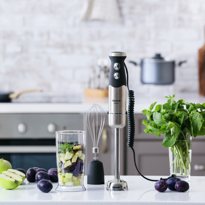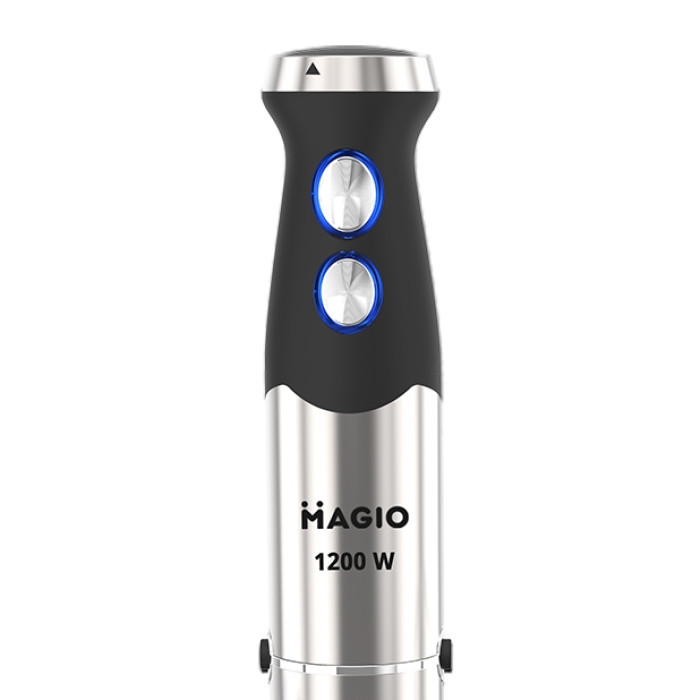 Блендерний набір MG-645 дозволить різноманітнити ваше меню та приготувати новий кулінарний шедевр. Потужність блендера становить 1200 Вт, що забезпечує безшумну ефективну роботу протягом тривалого часу. Занурювальна частина виконанана з нержавіючої сталі, а ніж з титановим покриттям – запорука стійкості до зношування і довговічності. Ергономічний держак з приємним покриттям SOFT TOUCH. Блендер може працювати на 13 швидкостях, що плавно перемикаються. Перемикач знаходиться на держаку приладу, що дуже зручно. До комплекту входять віничок для збивання та пластиковий мірний стаканчик об’ємом 600 мл. Ці властивості в поєднанні з компактним дизайном роблять блендер незамінним помічником на вашій кухні.