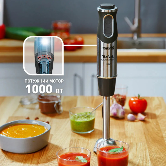 За допомогою ручного блендера Quickchef Tefal насолоджуйтеся оптимальною потужністю без будь-яких зусиль. Його ексклюзивна технологія Powelix в поєднанні з потужним двигуном потужністю 1000 Вт забезпечує високопродуктивне змішування і неймовірно плавні результати навіть для самих складних інгредієнтів - час від часу. З легкістю готуйте різноманітні страви і зберігайте повний контроль завдяки 20 безупинно регульованим швидкостям і інтуїтивно зрозумілому, простому у використанні циферблату. Крім того, захист від бризок і нековзна ручка забезпечують повний комфорт використання, а також безпечні для миття посуду деталі для легкого очищення.