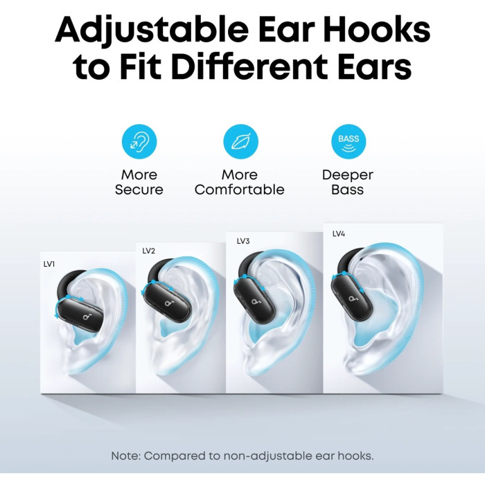 Гарнітура вирізняється інноваційним відкритим дизайном, який не закриває вушний канал, забезпечуючи комфорт без тиску та дозволяючи чути навколишні звуки. Завдяки 4-рівневим регульованим вушним гачкам, SoundCore V40i адаптується до будь-якої форми вуха, забезпечуючи надійну фіксацію навіть під час інтенсивних рухів. Ця конструкція не лише підвищує комфорт, але й наближає динаміки до вушного каналу, забезпечуючи глибший бас із приростом до 7.5 дБ порівняно з нерегульованими гачками, що робить звук насиченим і потужним.