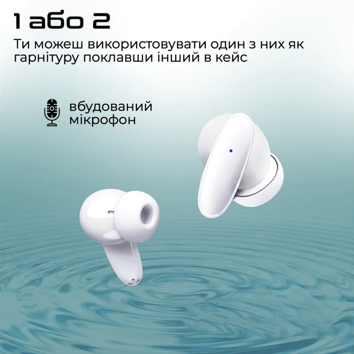 - 1 або 2: Навушники повністю автономні, можна використовувати один як гарнітуру, поклавши інший у кейс без додаткових налаштувань
