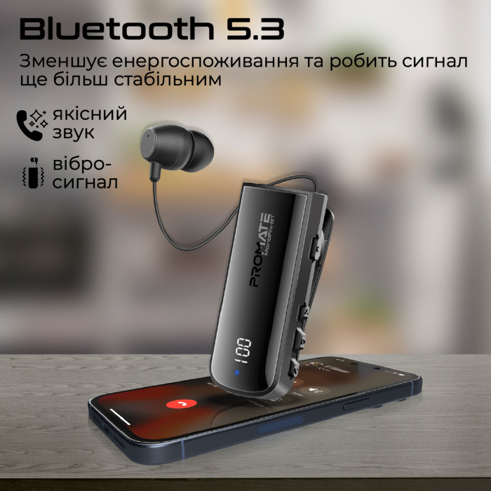 Monoflix-bt від Promate - це компактна бездротова гарнітура з витяжним навушником. Корпус із прищіпкою забезпечує зручність використання.