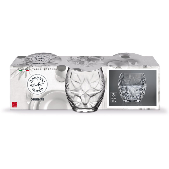 Эти стаканы являются частью коллекции Oriente, вдохновленной драгоценностью материалов и элегантностью форм стран Востока. Стакан имеет емкость 402 мл и предназначен для подачи натуральной, газированной или тонизирующей воды. Как и другие стаканы в этой коллекции, они были украшены многогранным узором, что делает их настоящим дизайнерским предметом, идеально подходящим для украшения стола.