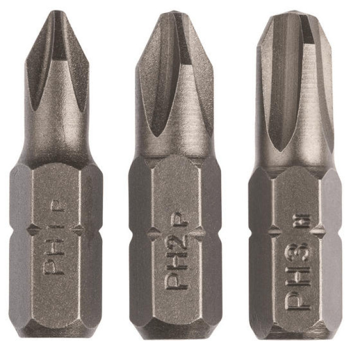 Набор из трех бит Bosch длиной по 25 мм - PH1, PH2, PH3. Изготовлены из высококачественной стали, насадки с шестигранным хвостовиком 1/4 дюйма.