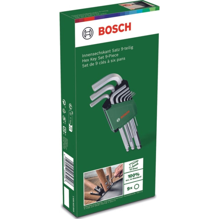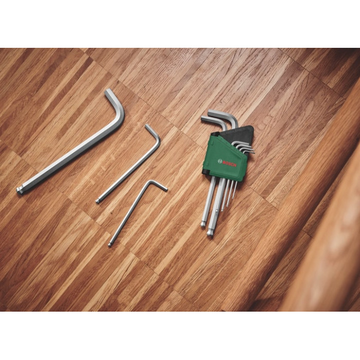 Набір шестигранних ключів Bosch на 9 предметів відкриває новий рівень гнучкості та зручності для домашньої механіки та майстрів, які збирають речі своїми руками. Кожен ключ у цьому зручному наборі виготовлений з найкращої у своєму класі сталі S2 і має нікелеве покриття з сатиновою обробкою. Це гарантує високу стійкість до іржі та тривалий термін служби. Для плавної роботи та гнучкого маневрування в шліцах усі ключі мають кулястий кінець для нахилу під кутом 30 градусів, а ключі з довгим плечем забезпечують більший крутний момент і є оптимальними для роботи у важкодоступних місцях.