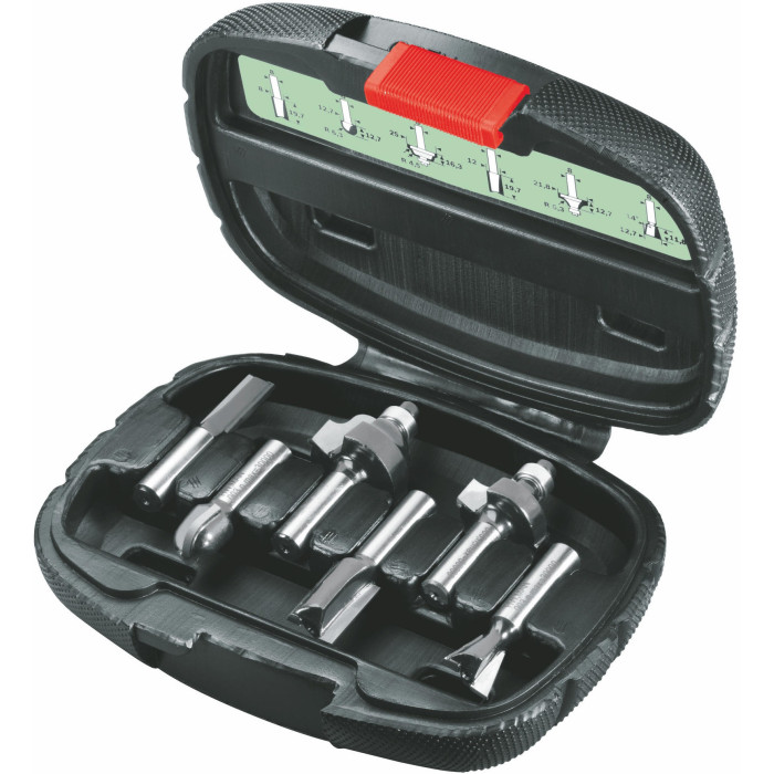 Набір із 6 фрез з карбіду вольфраму ідеально підходить для виконання основних робіт з фрезерування. Міцні твердосплавні наконечники, точна геометрія різання і гладко відшліфована поверхня забезпечують довгий термін служби. У комплект увійшли дві пазові, по одній карнизної, профільної, Галтельні фрези і одна насадка «ластівчин хвіст». З хвостовиком 8 мм.