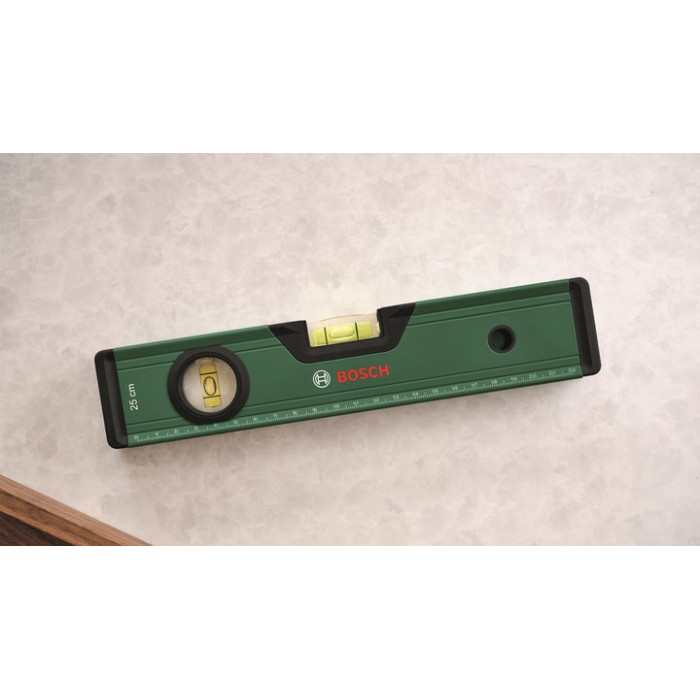 З рівнем Bosch Spirit Level 25 см полиці та картини висітимуть рівно за лічені секунди. Цей зручний універсальний інструмент забезпечує високоточні результати до 0,05 мм/м завдяки горизонтальному та вертикальному бульбашковим рівням. Завдяки яскравій флуоресцентній бульбашковій рідині у флаконах рівень легко зчитується. Цей рівень має метричну шкалу 0-22 см, тому вам не потрібно шукати другий інструмент, оскільки він виконує функцію лінійки.