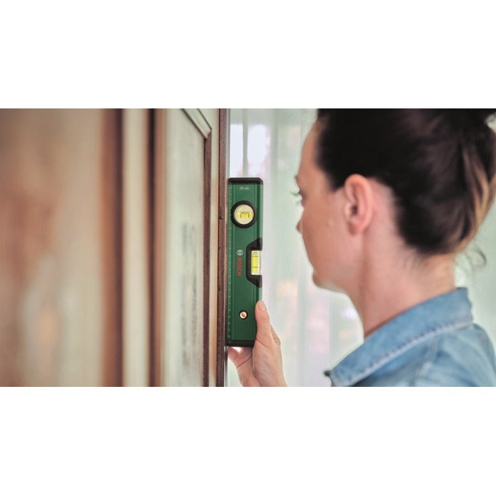 З рівнем Bosch Spirit Level 25 см полиці та картини будуть висіти рівно за лічені секунди. Цей зручний універсальний прилад забезпечує високоточні результати до 0,05 мм/м завдяки горизонтальному та вертикальному бульбашковим рівням. Завдяки яскравій флуоресцентній бульбашковій рідині у флаконах рівень легко зчитується. Цей рівень має метричну шкалу 0 - 22 см, тому вам не потрібно шукати другий інструмент, оскільки він виконує функцію лінійки.