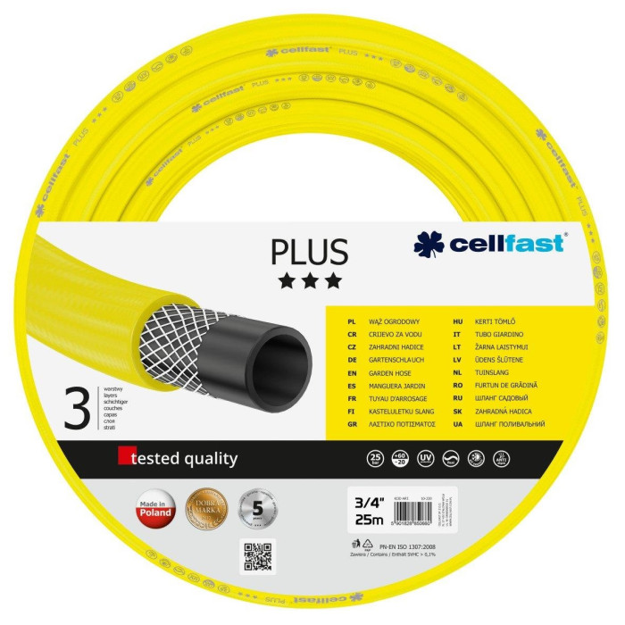 Шланг садовый Cellfast PLUS 3/4', 25м, 3-х слойный, до 25 Бар, -20...+60°C 10-221. Cellfast PLUS - это прочный и эластичный шланг из трех слоев ПВХ для подачи воды в сад, создания систем полива, использования для хозяйственных нужд или орошения городских зеленых насаждений. В составе материалов нет кадмия и бария, поэтому им безопасно поливать огородные культуры. Структура и ее преимущества. Шланг Cellfast PLUS состоит из трех слоев: внутреннего черного, армированного и внешнего желтого. Внутренний слой создан из ПВХ - эластичной износостойкой пластмассы.
