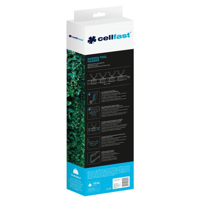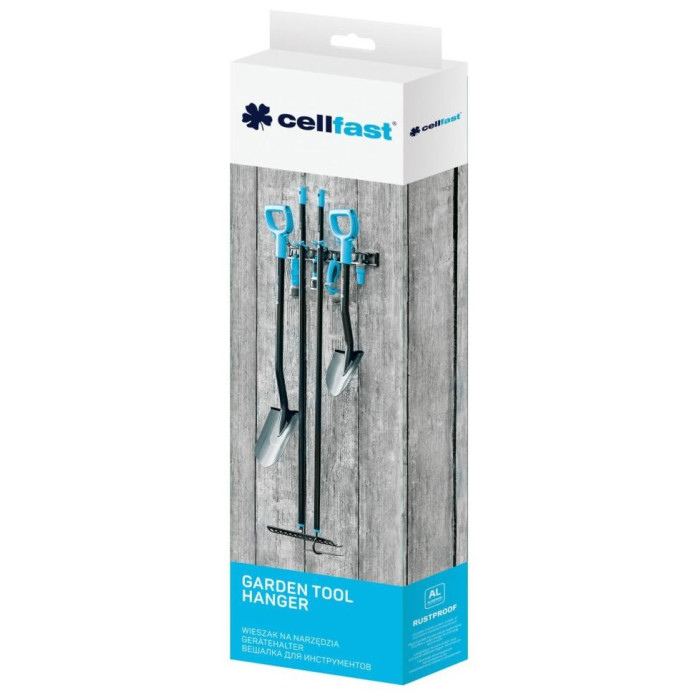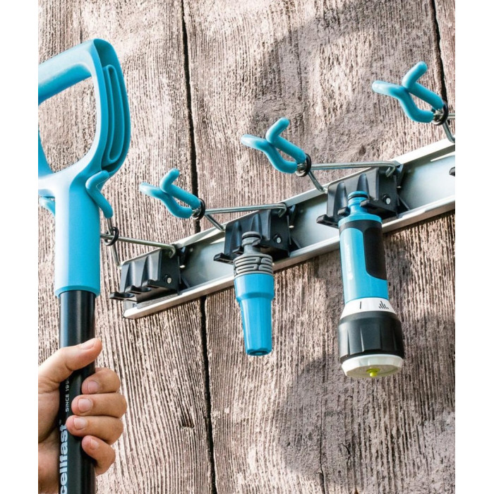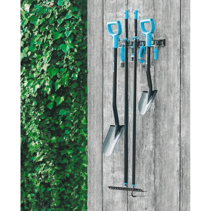 Вішалка для інструментів: Міцна конструкція вішалки виконана із стійкого до корозії алюмінію. Чотири ручки з автоблокуванням дозволяють повішення будь-яких інструментів та аксесуарів, їхню відстань можна регулювати в залежності від потреб. Вісім додаткових тримачів дозволяє закріпити на ній аксесуари для поливу, наприклад, конектори або зрошувачі. Кінчики тримачів забезпечені м'яким пластиком. Максимальна вантажопідйомність – 10 кг, ширина: 505 мм.