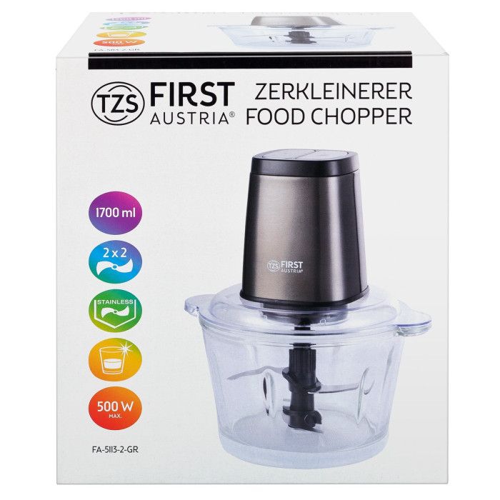 Подрібнювач FIRST FA-5113-2-GR відрізняється не лише своєю функціональністю, а й зручністю використання. Скляна чаша об'ємом 1,7 л дозволяє готувати великі порції страв, що є особливо важливим для сімейних обідів або вечерь. Прозорий матеріал чаші дозволяє контролювати процес подрібнення, що допомагає досягти ідеальної консистенції продуктів.