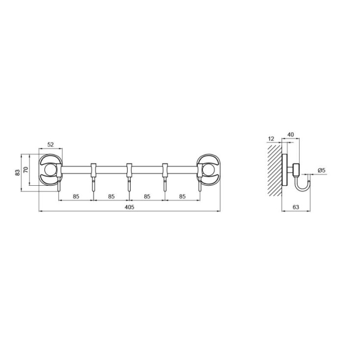 Крючки - 5 шт., соединительная планка, держатели планки - 2 шт., крепежи ( дюбель-гвоздь - 4 шт.).