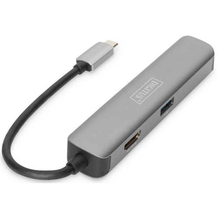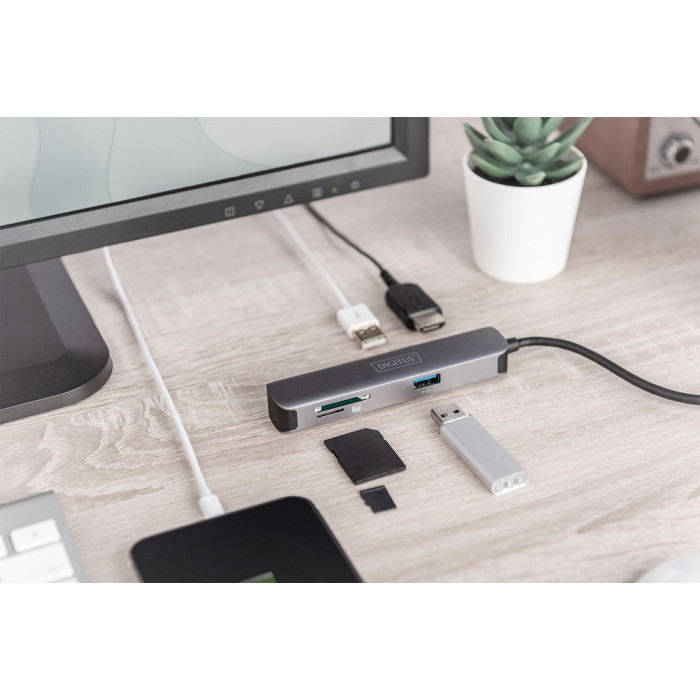 За допомогою адаптера DIGITUS® USB-C™ до HDMI® ви можете підключити додатковий дисплей HDMI® до існуючого пристрою з портом USB-C™. Це дозволяє відтворювати ваш контент на великому моніторі, проекторі або телевізорі з роздільною здатністю 4K. Для підключення іншого периферійного обладнання доступні два додаткові роз'єми USB 3.0. Ви можете навіть підключити додатковий USB-концентратор, щоб збільшити кількість USB-підключень. Вбудований кардрідер може бути оснащений картками SD та MicroSD і може використовуватись для обох носіїв одночасно. Завдяки компактній конструкції з док-станцією DIGITUS® легко подорожувати – вона ідеально підходить для ділових поїздок та презентацій на дисплеях HDMI® усіх типів.