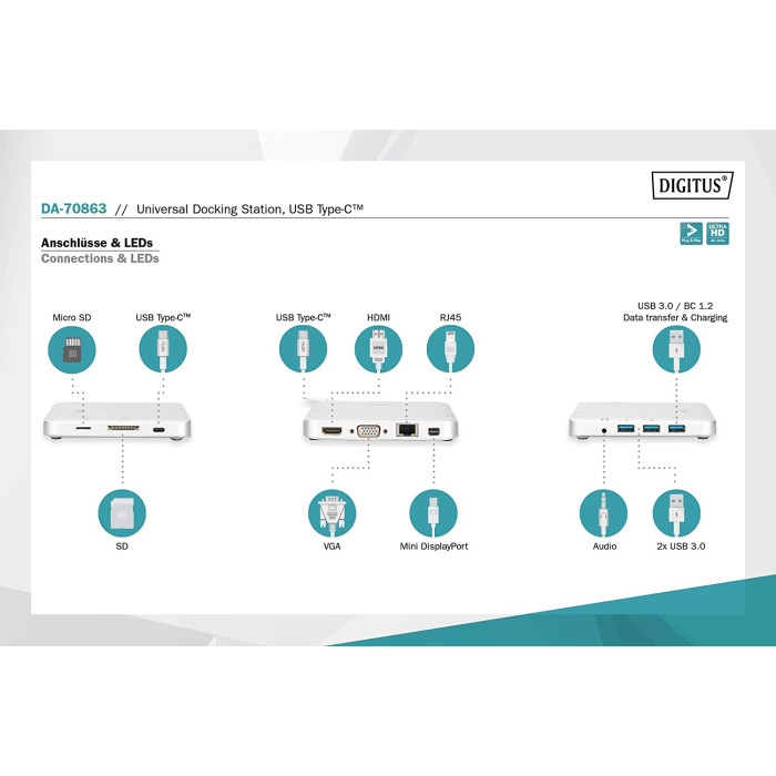 Полнофункциональная универсальная док-станция USB Type-C™ от Digitus предлагает все необходимое для создания полностью оборудованного рабочего места. Он предлагает три видеоинтерфейса (HDMI, MiniDP и VGA), где два монитора могут работать одновременно. Таким образом достигается максимально возможное поддерживаемое разрешение: Brilliant UHD (4K2K/30Hz). Кроме того, он предлагает три порта USB 3.0, где один порт (5 В / 1,5 А) также обеспечивает функцию зарядки мобильных устройств. Интерфейсы USB дополняются USB-C с функцией подачи питания (PD).